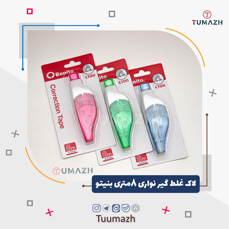 محصولی که در این صفحه عرضه شده لاک غلط گیر نواری بنیتو است که عرض نوار 5 میلیمتر و طول آن 8 متر است.